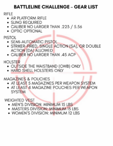 Centerfire rifle, shoulder strap will make it easier, two magazines. We will use paper, so any bullet configuration is acceptable. Gun or tactical light for after dark shooting.